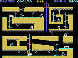 You are the Bagman. You move through various mine shafts, picking up money bags and placing them in a wheelbarrow at the surface of the mine. It is known in France as Le Bagnard.